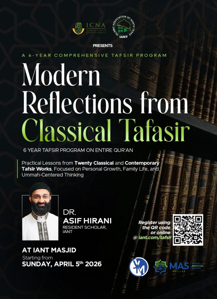 Modern reflections from classical tafasir focused on personal growth, family life, and ummah-centered thinking. Led by Dr. Asif Hirani. Inshallah, every Sunday, between 9am and 12pm.